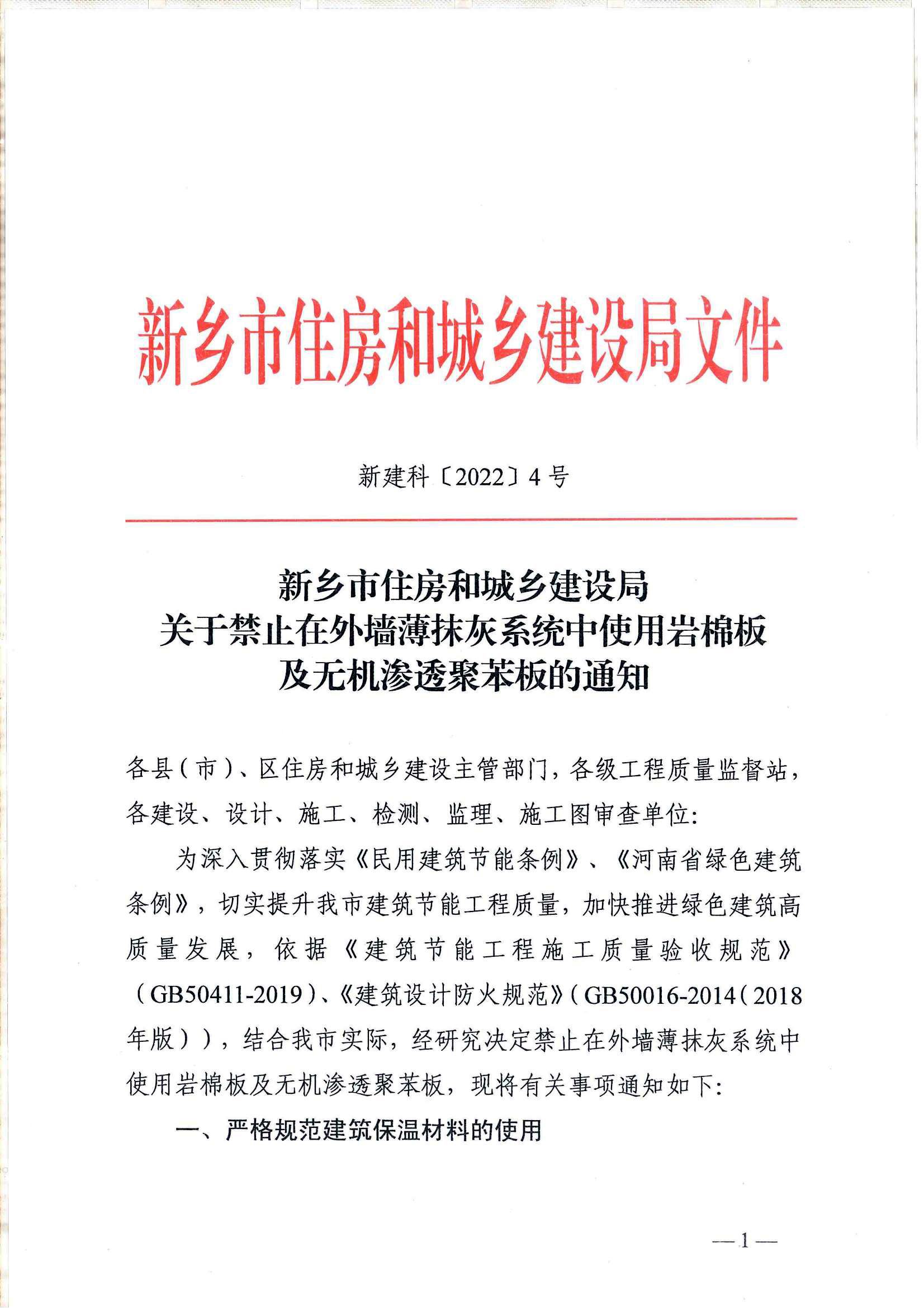 2022年5月20日新乡市住房和城乡建设局发文《关于禁止在外墙薄抹灰系统中使用岩棉板和无机渗透聚苯板的通知》,新乡市成为河南省内继开封第二个明确发文限制或禁止岩棉在外墙薄抹灰系统中使用的地级市,此文件除禁止岩棉在外墙薄抹灰系统中使用外,也禁止了采用无机渗透工艺所生产的无机渗透聚苯板作为A级保温材料在外墙薄抹灰系统中的使用。